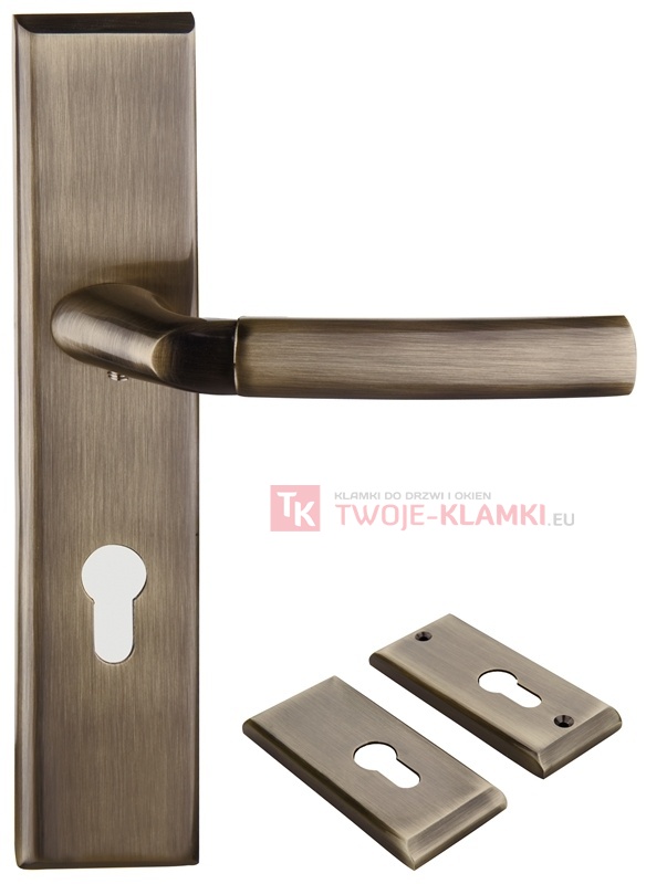 Zeus, klamki z długim szyldem + szyldy górne, patyna